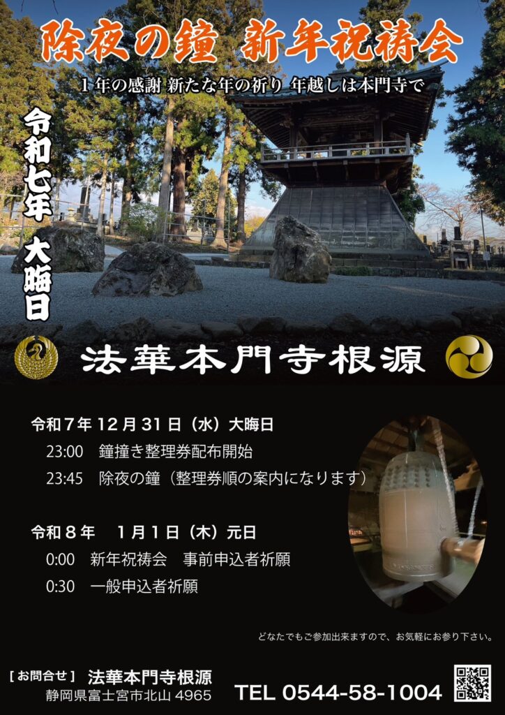 当山は永仁6年(1298)2月15日、日蓮大聖人の直弟子で「一期弘法」を付嘱された白蓮阿闍梨日興上人により開創された日蓮宗大本山である。日興上人は日蓮大聖人第7回忌の正応元年(1288)12月に身延を下山。南条時光の屈請により上野大石ヶ原に草庵を結ばれたが石川能忠・南条時光両地頭の寄進、小泉法華衆・上野講衆の合力を得て「日蓮聖人御影堂」「本化垂迹天照太神宮」「法華本門寺根源」の三堂を造立された。